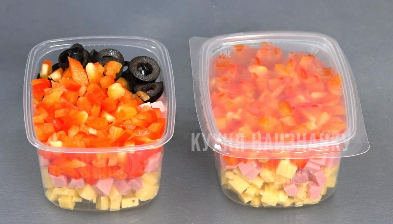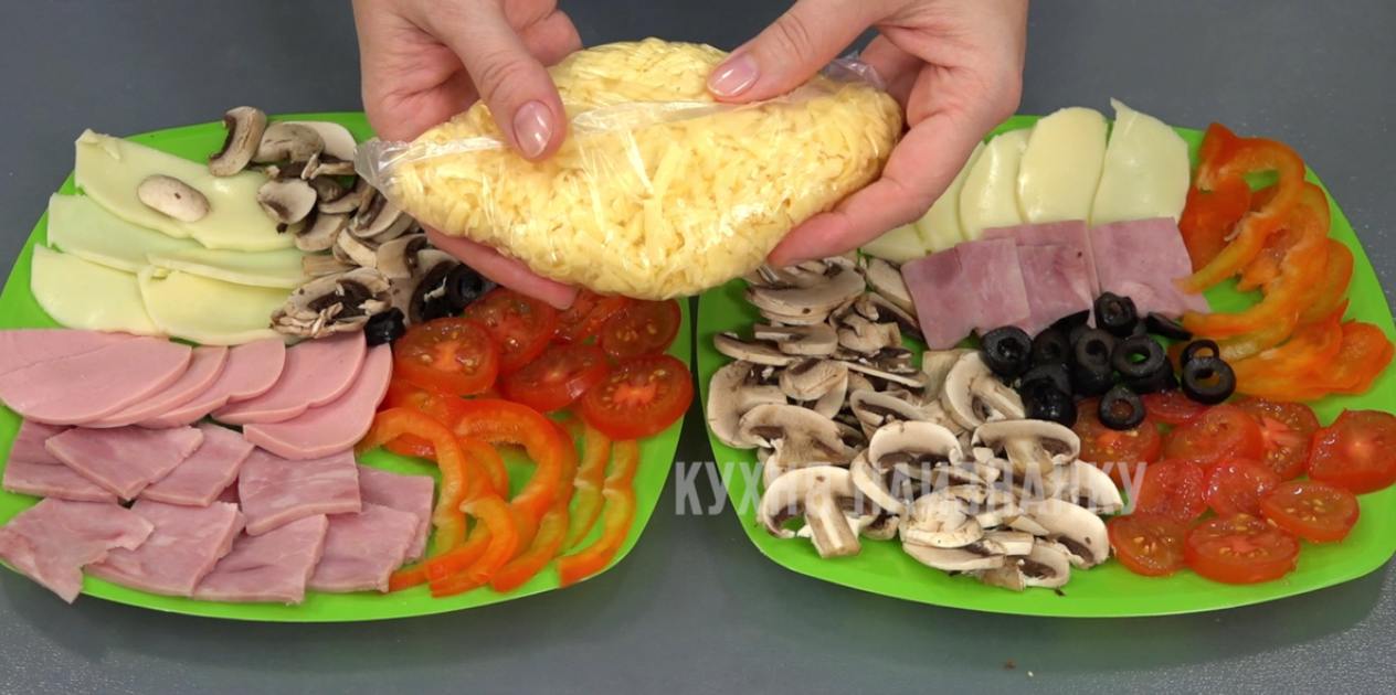 А еще я делаю наборы для пиццы. Все, что остается, нарезаю и выкладываю на пластиковые тарелочки. Ветчина, например, остатки запеченной курицы, грибы, перец, помидоры, сыр моцарелла, маслины... Твердый сыр я натираю на терке, складываю в пакет и так замораживаю. Тарелки затягиваю пленкой. Много места они не занимают и очень удобно потом использовать.