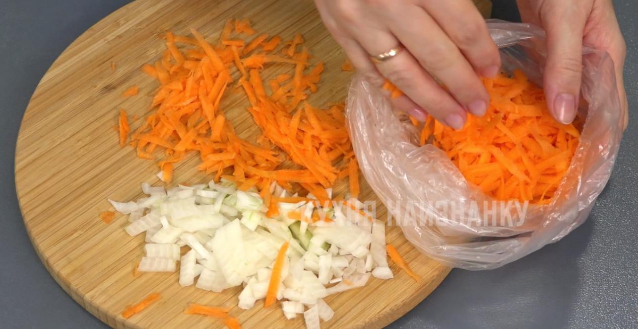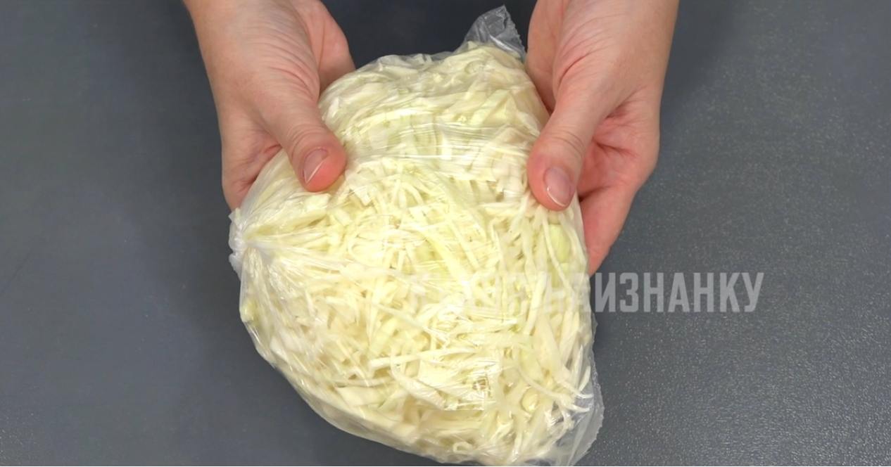 Теперь овощи. Капусту нарезаю тонкой соломкой. Складываю в пакет, выдавливаю из пакета воздух и завязываю. Такую капусту потом можно протушить, добавить в борщ, приготовить капустный пирог или начинку для пирожков.