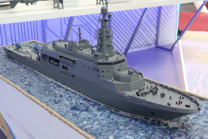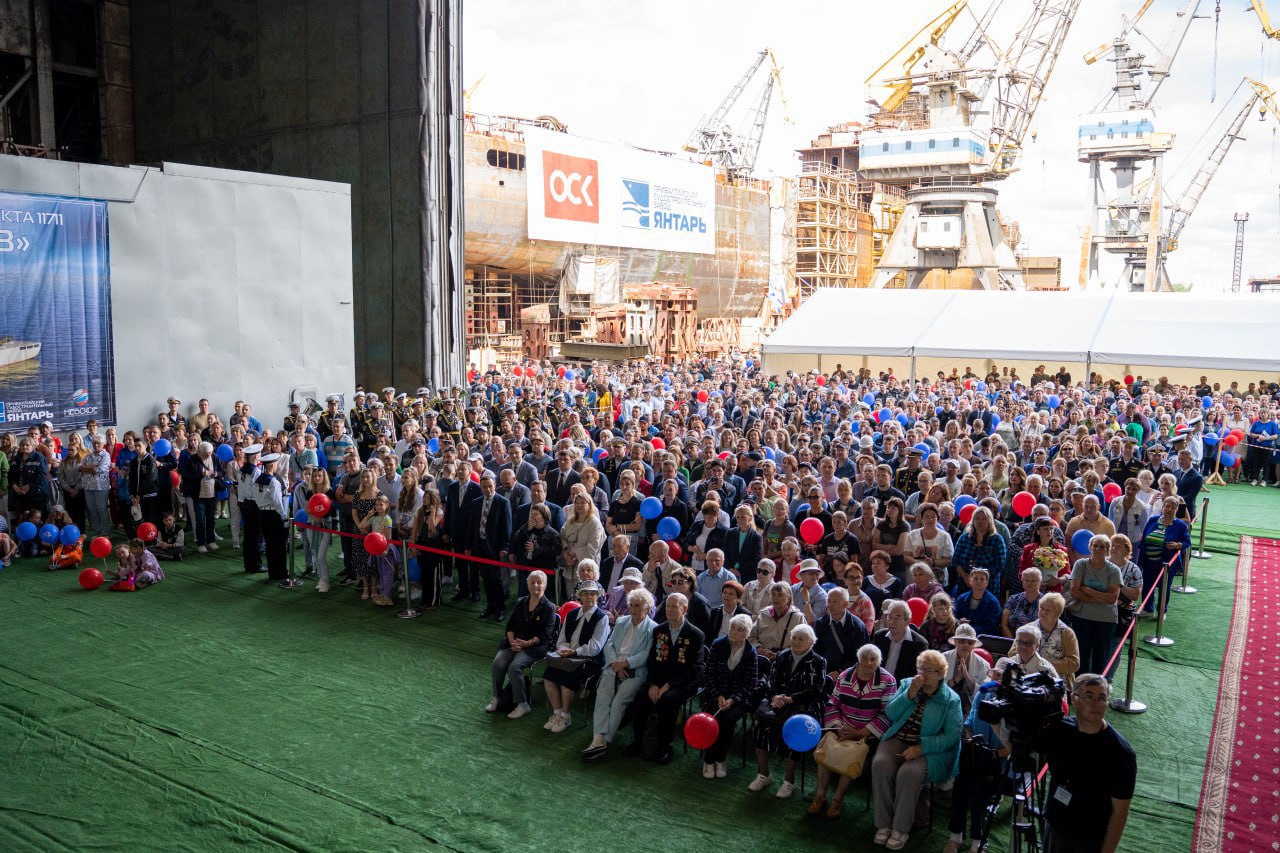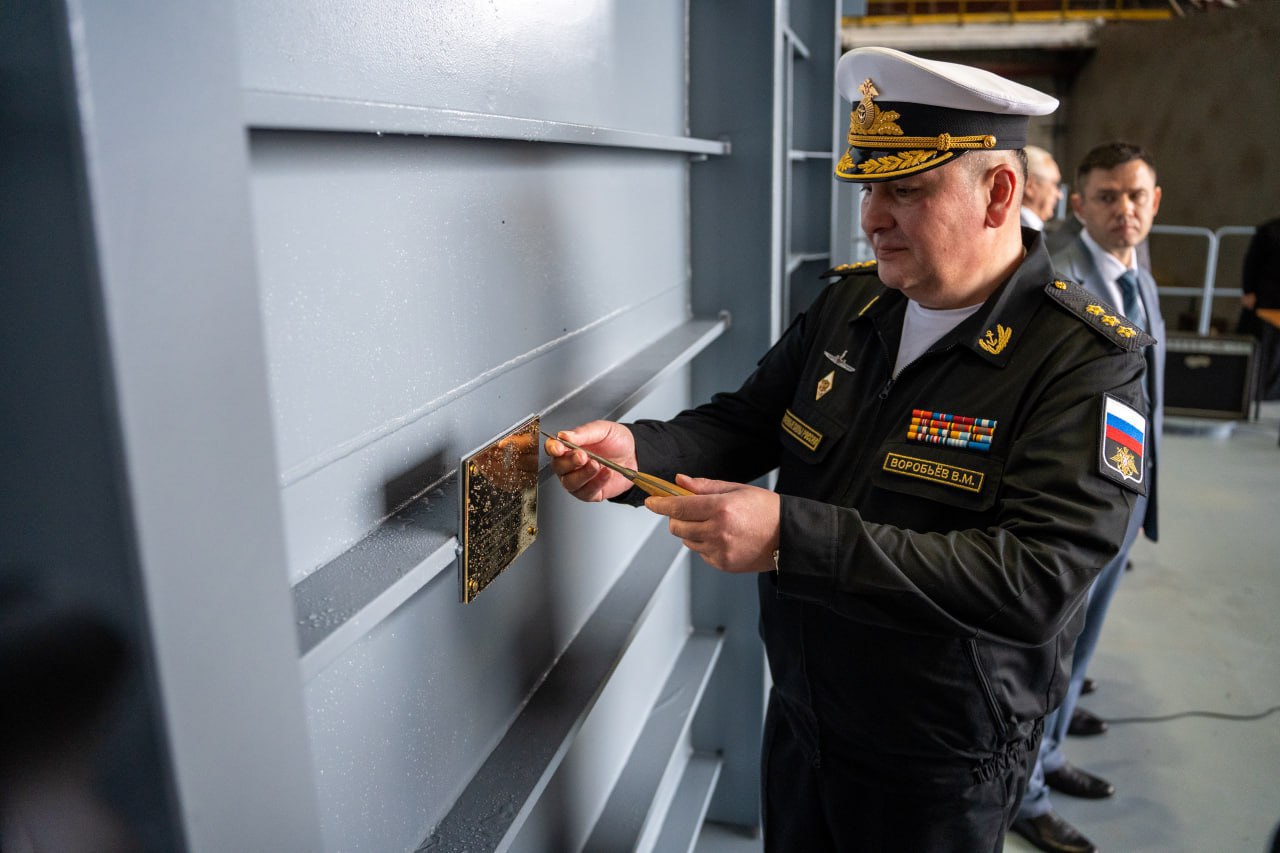 На заводе «Янтарь» заместитель главнокомандующего ВМФ России адмирал Владимир Воробьёв под звуки военного оркестра прикрепил закладную табличку на секции будущего корабля.