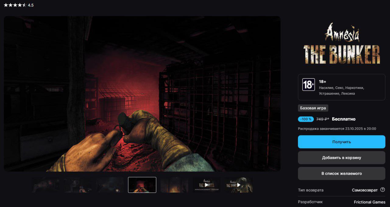VG/Двачдень назад ФОТО ФОТО ФОТО ФОТО Хоррор Amnesia: The Bunker теперь можно бесплатно забрать в EGS и на РУ-регионеВ Steam у игры 93% положительных отзывов и ценник 880 рублей.Щедрость продлится до 23 октября: store.epicgames.com/ru/p/amnesia-the-bunker-9d5799 Темы и тегиМексикаИгры и КиберСпортamnesia ру-регион bunker EGS Steam хоррор the щедрость