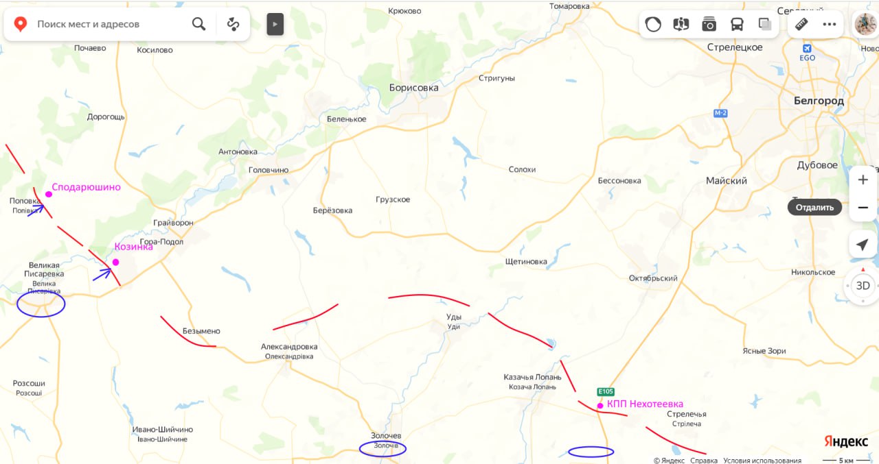Между тем, это не единственное опасное направление. Целый день сегодня ВСУшные части маневрировали в районе КПП Нехотеевка (на дороге между Харьковом и Белгородом, но в бой вступить не решались. Причем, силы явно больше тех, которые здесь были использованы 12 марта, когда похоже тут проводилась лишь разведка боем. Угроза отсюда чувствуется и противник стоит на изготовке (как и в районе Золочева).