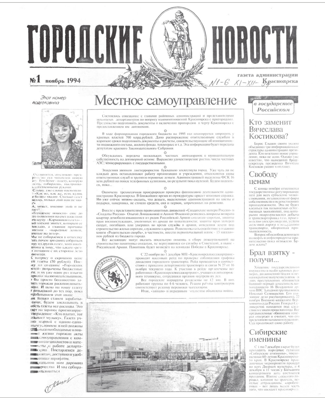 С первой полосы к читателям обращалась редактор «Городских новостей» Галина Кошкина. В том же номере можно было, например, найти интервью с директором МП «Красноярскпассажиртранс» Валерием Зайковским и важные новости из жизни Красноярска.