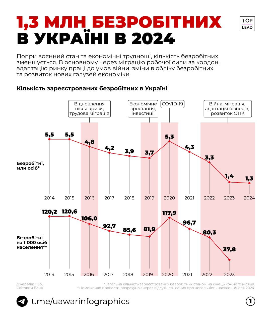 В 2024 году в Украине зафиксировано 1,3 млн безработных, — инфографика Uawarinfographics