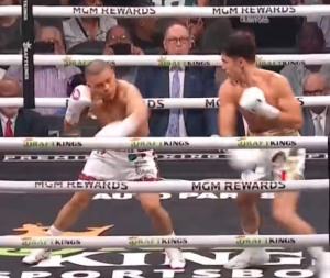 .@IsaacPitbull98 connects with a sweeping left hook in RD4, despite having difficulty getting past @GCabreraBoxing’s long reach. #CruzCabrera