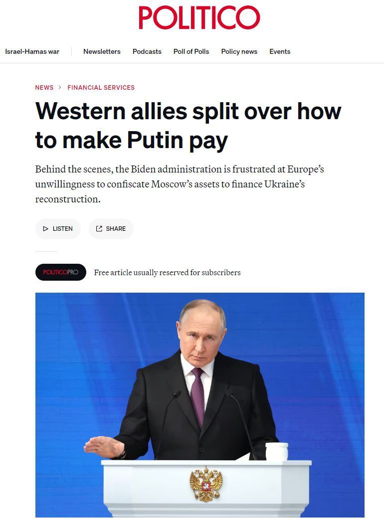 Соединённые Штаты и ЕС горят желанием заставить Россию платить за восстановление Украины, но не могут договориться, как далеко зайти, пишет Politico. Идея конфискации замороженных российских активов, а речь идёт о более чем 250 млрд евро, кажется очень заманчивой, но вызывает напряжённость в отношениях между союзниками.