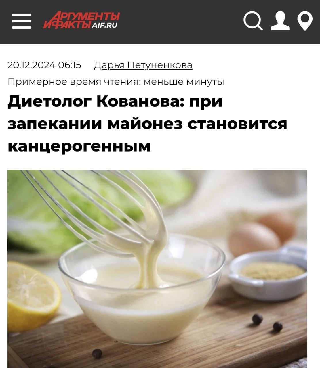 Майонез вызывает рак, если его запечь: при температуре 100°C он распадается на воду и жир, который становится канцерогенным.