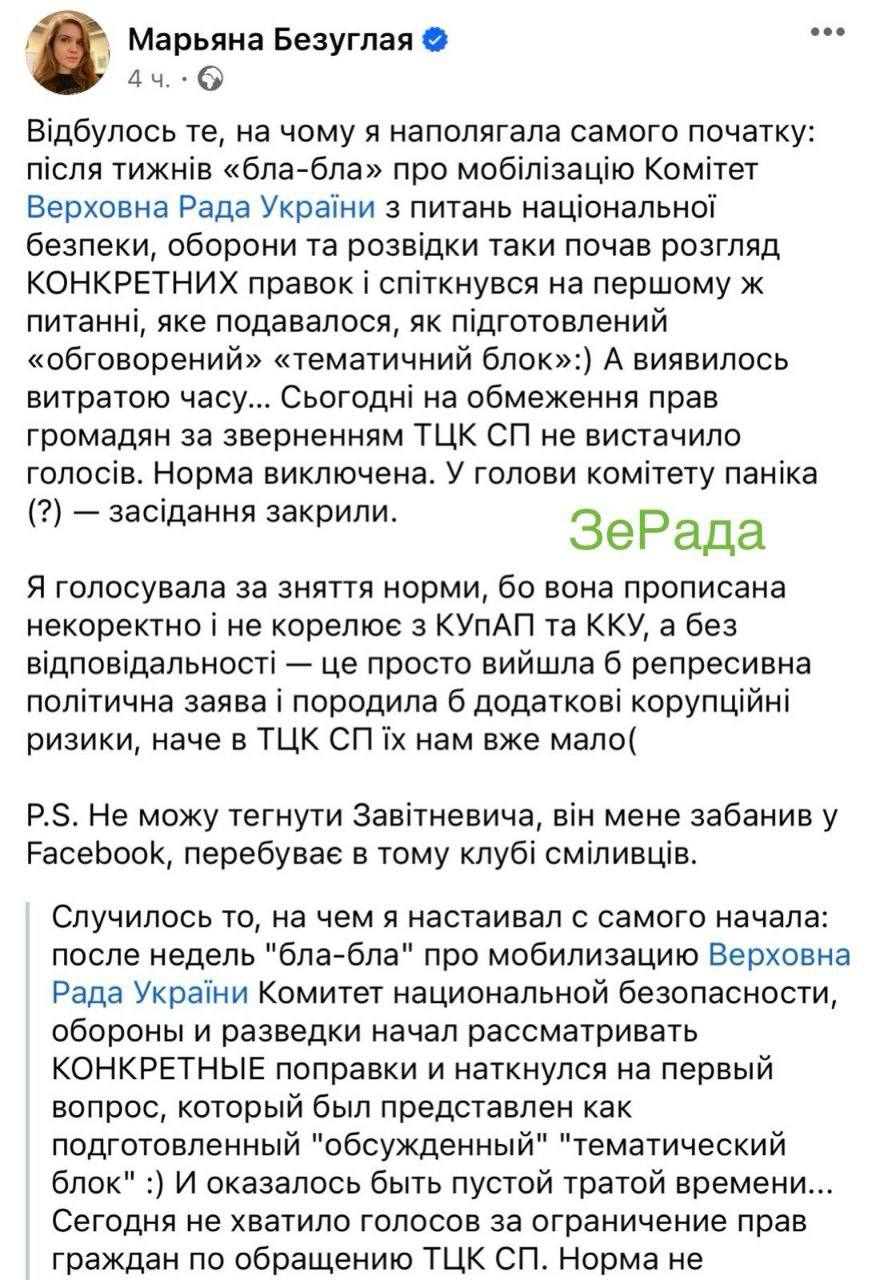 «После недель "бла-бла" о мобилизации Комитет таки начал рассмотрение конкретных правок и споткнулся на первом же вопросе, который подавался, как подготовленный "обсужденный" "тематический блок". А оказалось тратой времени. Сегодня на ограничение прав граждан по обращению ТЦК СП не хватило голосов. Норма исключена».