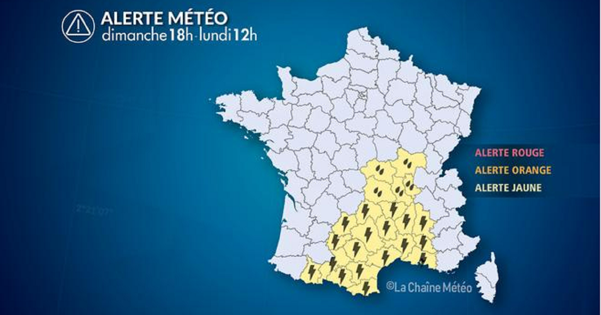 Cette situation a poussé La Chaîne Météo à placer 18 départements en alerte jaune pour orage : l’Ardèche, l’Ariège, l’Aude, l’Aveyron, les Bouches-du-Rhône, le Cantal, la Drôme, le Gard, la Haute-Garonne, l’Hérault, la Haute-Loire, le Lot, la Lozère, les Hautes-Pyrénées, le Tarn, le Tarn-et-Garonne et le Vaucluse. Ainsi que 5 départements en alerte jaune pour inondation : l’Allier, la Loire, le Puy-de-Dôme, le Rhône et la Saône-et-Loire.