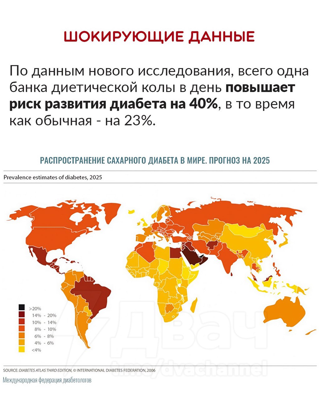 Она повышает риск диабета на 40%, тогда как у колы с сахаром этот показатель — 23%.
