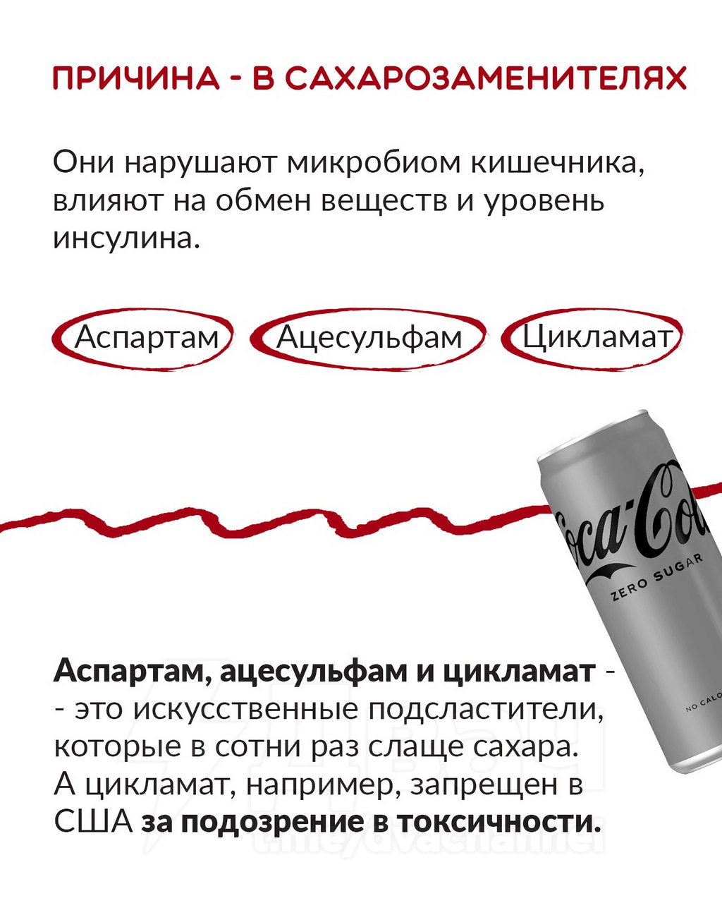 Причина — сахарозаменители аспартам, ацесульфам и цикламат: они нарушают микробиом кишечника, влияют на обмен веществ и повышают уровень инсулина.