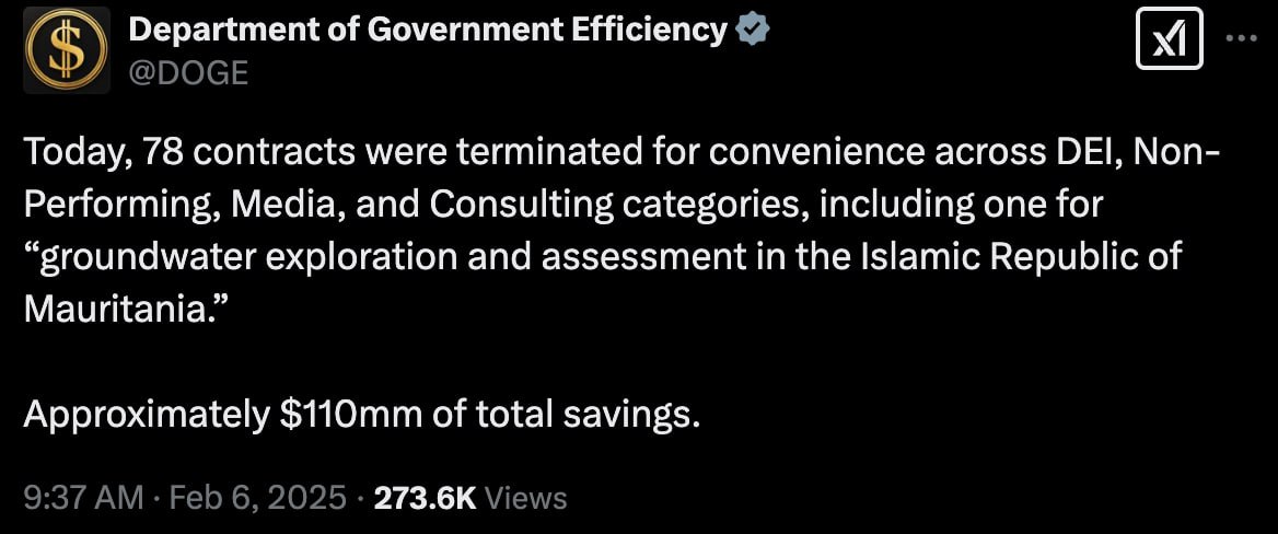 Сегодня было расторгнуто 78 контрактов, которые не выполнялись должным образом или не приносили ожидаемых результатов, включая DEI (программы, связанные с разнообразием, равенством и инклюзивностью), медиа и консалтинг. В их числе один контракт на «разведку и оценку грунтовых вод в Исламской Республике Мавритания». Общая экономия составляет примерно 110 миллионов долларов.