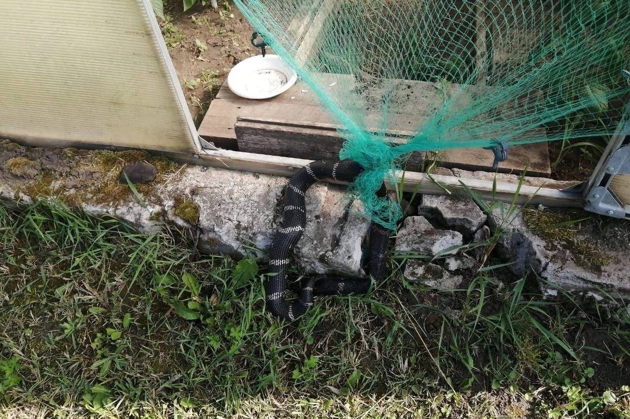 Судя по фото, едва заметное на фоне травы пресмыкающееся чёрно-белого окраса увидели у входа в постройку. В итоге к делу были привлечены спасатели. Вооружившись перчатками и специальными приспособлениями, они поймали гадюку и выпустили её в лесу, подальше от жилых кварталов.