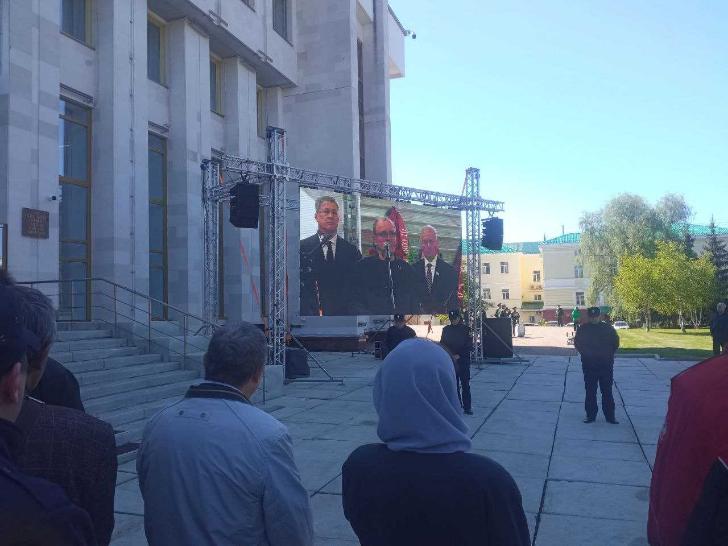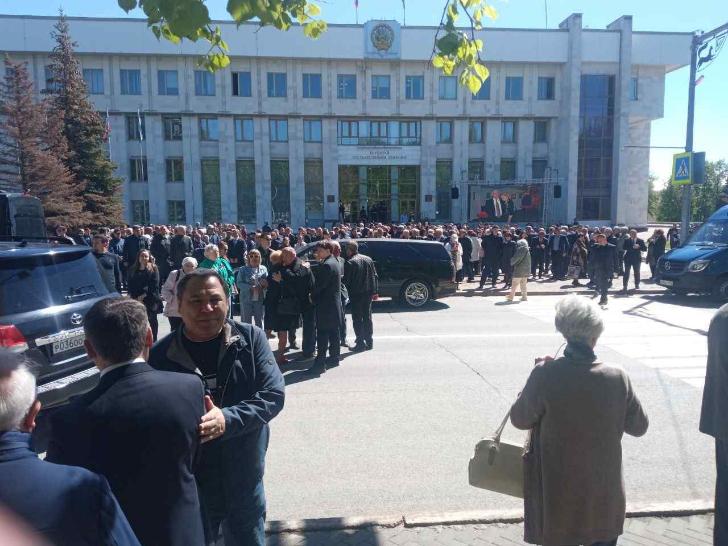 Примерно таким образом выглядела процессия с 9 до 11 часов. К этому времени подошли первые лица республики: Радий Хабиров, Азат Бадранов, Урал Кильсенбаев, Амина Шафикова. Все больше росла и народная толпа перед зданием.