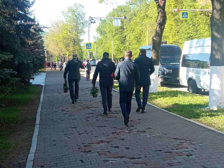 Организаторы время от времени убирали цветы перед гробом, перенося их на другой стол — уж слишком много людей с гвоздиками пришло проститься с экс-мэром.