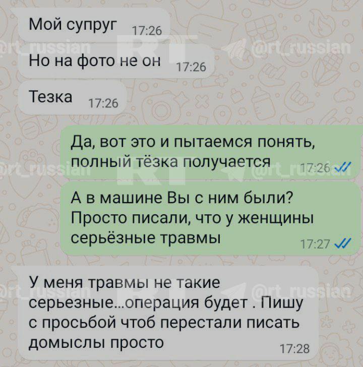 Жена Андрея Торгашова, пострадавшего в результате взрыва авто в Москве, подтвердила RT, что её мужа, тоже военного, спутали с замначальника радиоцентра спутниковой связи.