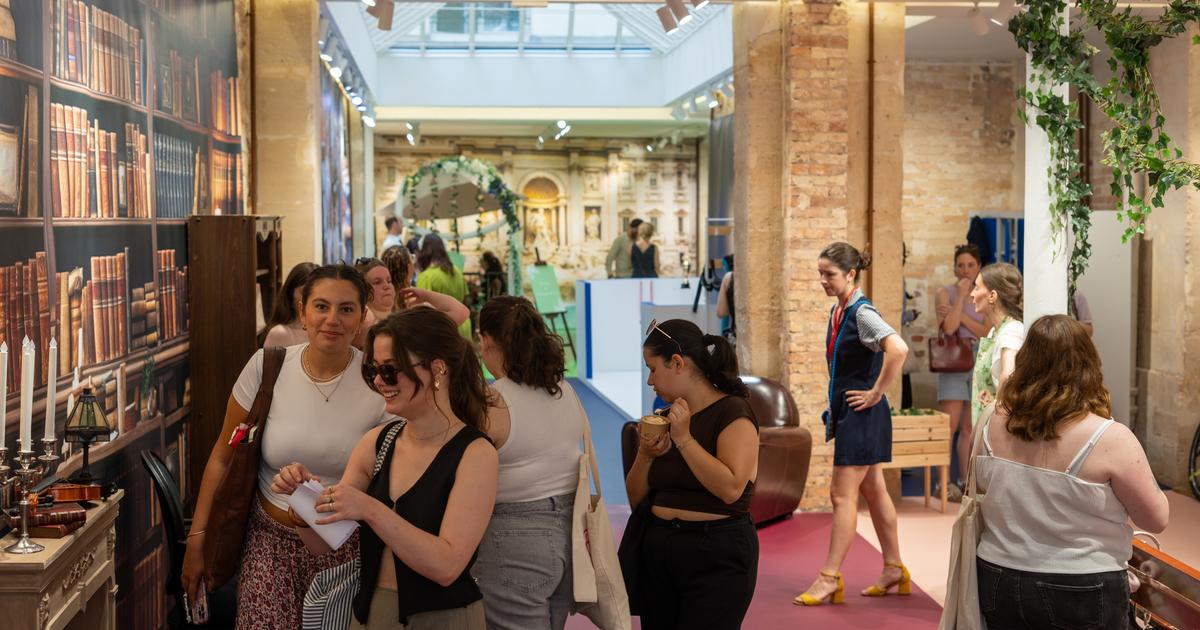Dès l’entrée, les visiteurs – ou plutôt les visiteuses, puisqu’un seul homme se mêle à la foule en ce vendredi après-midi – sont accueillis par le parfum de fleurs fraîches. Et pour cause, le lieu offre une plongée dans les décors de la saga, en commençant par la boutique de fleuriste ornée de bouquets de Nolia, la protagoniste du troisième tome Un printemps pour te succomber. En face, une bibliothèque ancienne, un fauteuil Empire et un épais tapis rouge reproduisent l’ambiance mystérieuse du premier tome Un automne pour te pardonner.