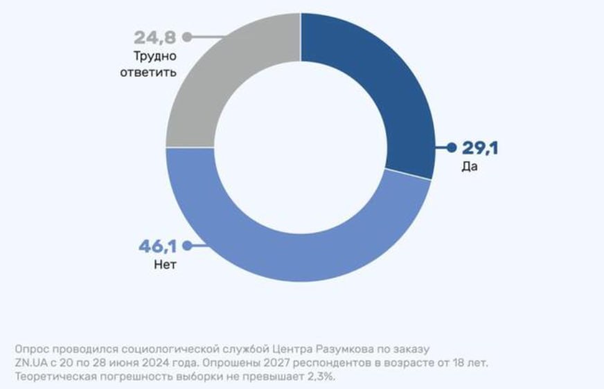 Почти половина жителей Украины (46%) не считает стыдным уклонение от призыва во время мобилизации, показал соцопрос, результаты которого публикуют украинские СМИ. Обратного мнения придерживаются 29,1%.