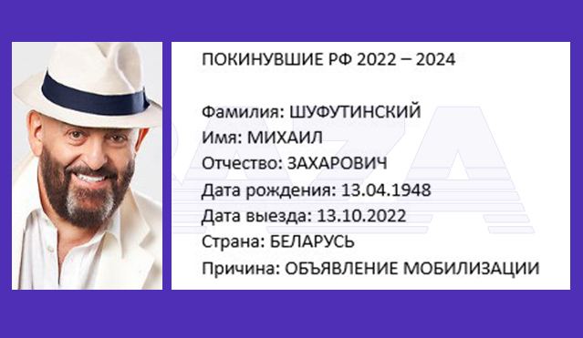 Один из самых неожиданных персонажей в базе — 76-летний певец Михаил Шуфутинский. Как указано в его карточке, Михаил Захарович уехал в Белоруссию по причине «объявление мобилизации».