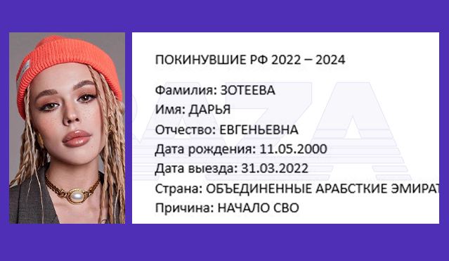 Редакция нашла в базе данные Аллы Пугачёвой и Максима Галкина, причём уехали они в разные дни и по разным направлениям — Пугачёва в Израиль, Галкин в Швейцарию. В базе покинувших есть Инстасамка и её муж Олег Еропкин — как там указано, они уехали в ОАЭ по причине «начала СВО».