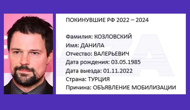 Также в базе есть данные бойца UFC Александра Волкова (Турция — «начало мобилизации»), блогера Данилы Поперечного (ОАЭ — «начало мобилизации»), ютубера Мамикса («после мобилизации», куда — неизвестно), Данилы Козловского (Турция — «начало мобилизации»), Семёна Слепакова (Израиль — «начало мобилизации»), Ильи Прусикина (ОАЭ — «начало СВО»), Элджея (ОАЭ — «начало СВО») и Федука (Турция — «начало мобилизации»).