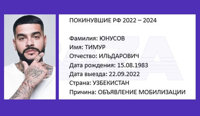 В базе есть данные Тимати — как указано в карточке, он уехал в Узбекистан на следующий день после объявления о мобилизации. Впрочем, Тимати сам выкладывал из поездки фото в соцсети, за что получил порцию критики и затем написал пост, что он «дома, никуда не собирался мигрировать и не собирается».