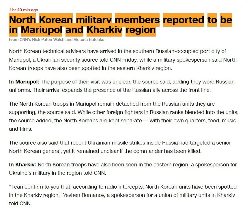 ✔️ CNN продолжает цитировать спикеров СБУ и ВСУ, в связи с чем северокорейские войска для американских потребителей CNN, кроме Курской области размещены также в Харьковской области и даже расквартированы в Мариуполе🤷♂