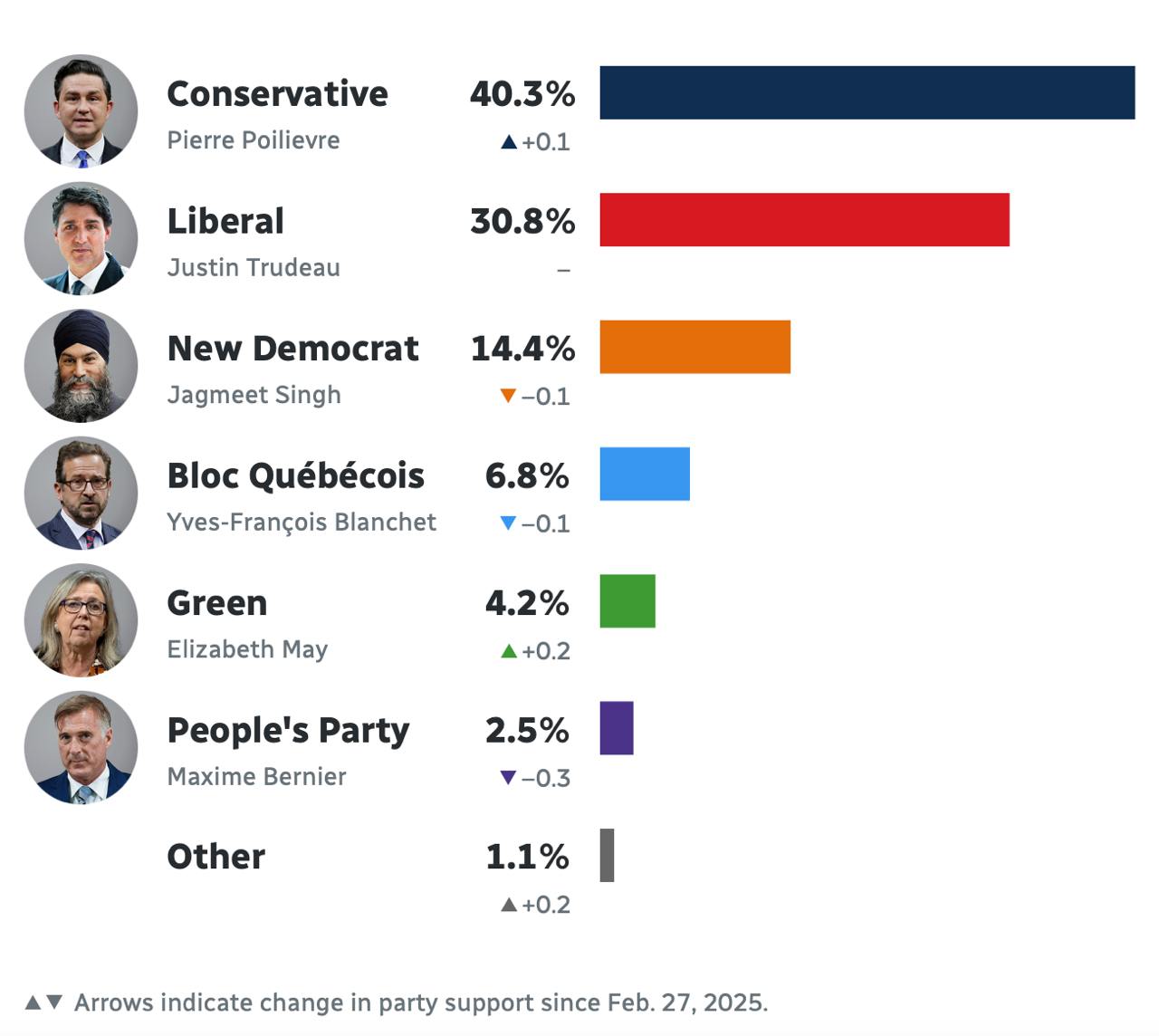Канадские либералы надеются воспользоваться взлётом антиамериканских настроений в стране. В предвыборной гонке их позиции слегка укрепились. Однако они всё ещё отстают от консерваторов во главе с Пьером Пуальевром, который делает упор на решение внутренних проблем. Если же сейчас экономика Канады на фоне тарифных войн дестабилизируется, то шансов отстранить либералов от власти и устроить смену режима в Оттаве точно будет больше.