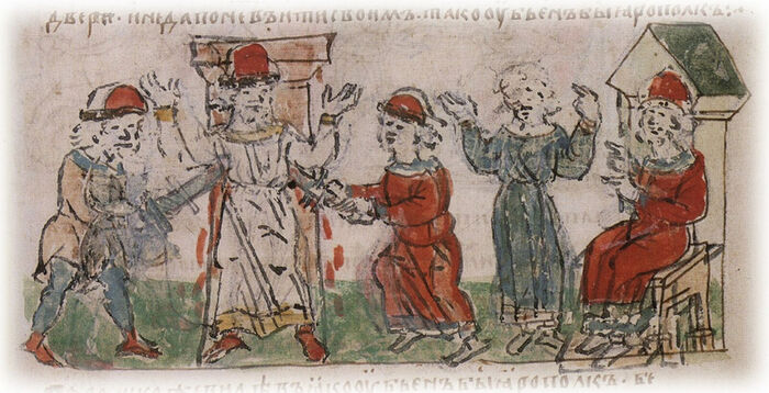 «“Поприяй ми! Аще убью брата своего, имети тя начну в отца место своего, и многу честь возмеши от мене: не я бо почал братью бити, но он. Аз же того убояхъся и придох на нь”. И рече Блуд къ посланым Володимиром: “Аз буду ти в приязнь”»[7].