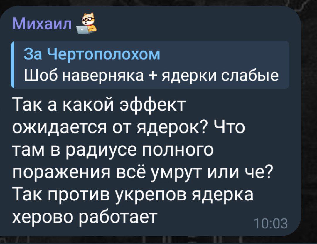 После чего вводим тд в ядерный прорыв, продвижения на 10 км в сутки будет достаточно для парализации всего украинского фронта т.к. хохлу придется тратить силы на выявление ДРГ в Дружковке и Краматорске (западные окраины) в ситуации, когда мы на след день можем еще 7 малышей ебануть.