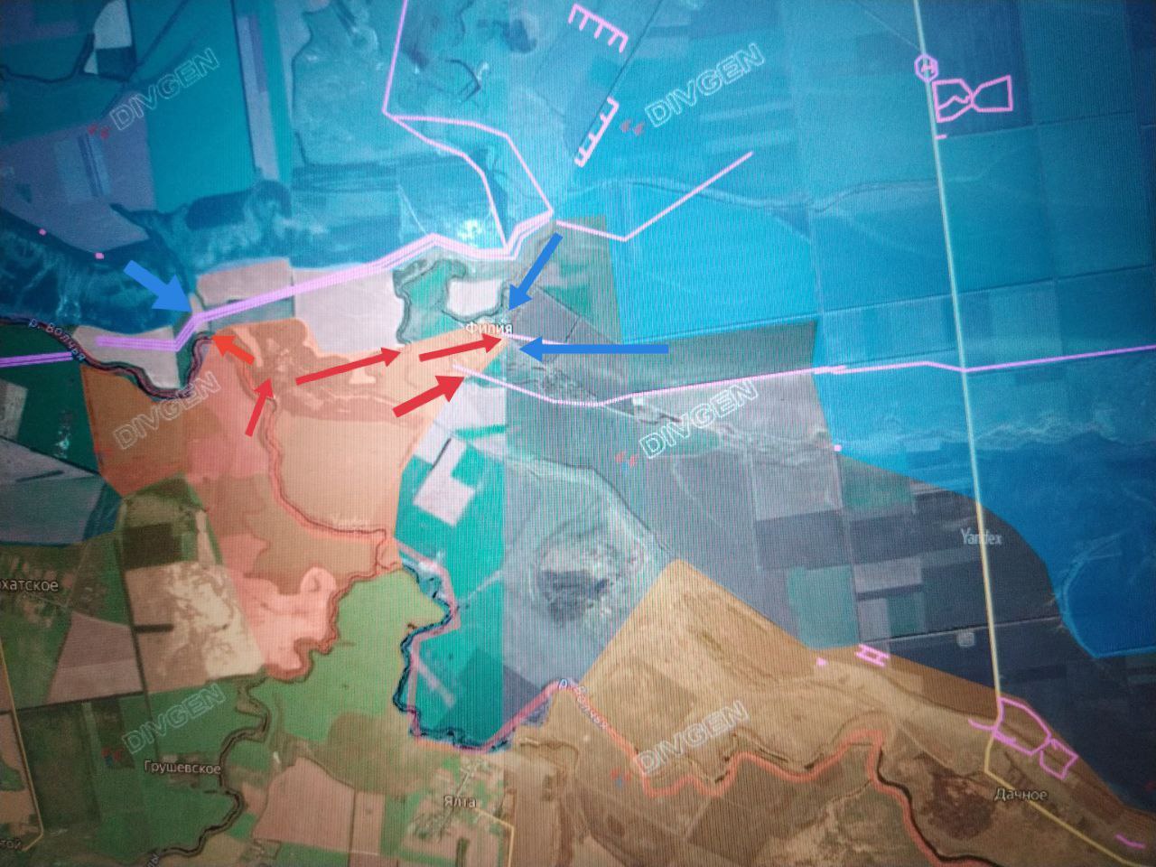 Накануне наши штурмовые подразделения обошли противника с фланга, переправились через р. Волчья, зашли в лес западнее Филии и оттуда вошли в южную часть Филии. Идёт штурм села. Противник контратакует, перебрасывает резервы.