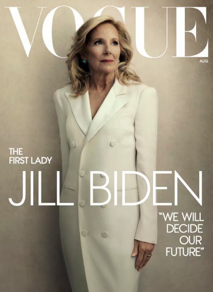 Модненькое издание Vogue поместило на обложку своего свежего номера фото супруги старичка Джо Джилл Байден. Белое платье-смокинг от Ralph Lauren как бы говорит, что американцам лишний раз волноваться не надо, всё у них будет хорошо даже после провальных дебатов с Дональдом Трампом.