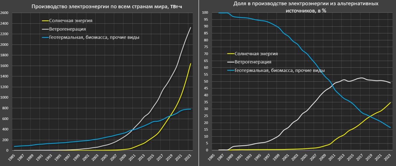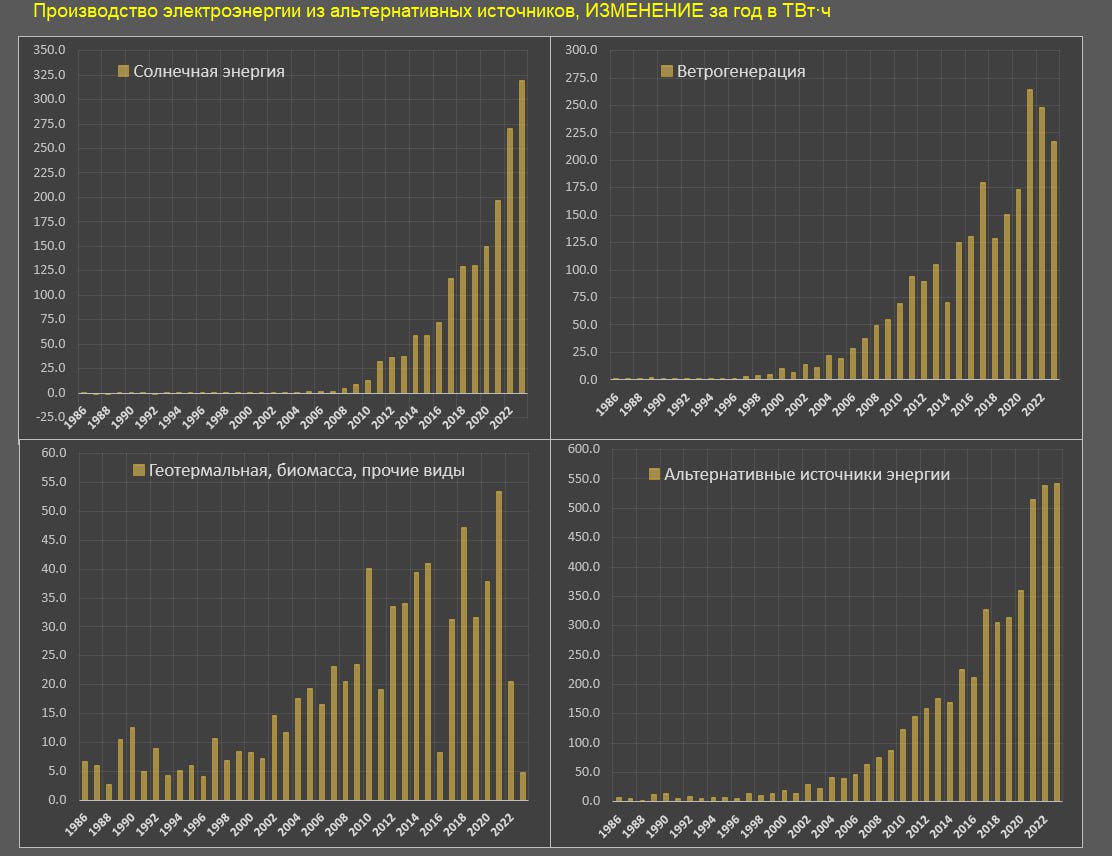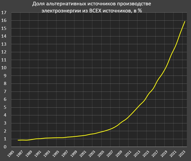 Чтобы оценить масштаб экспансии, отмечу, до 2000 года доля энергии из альтернативных источников в общем производстве из всех источников была меньше 1.5%, в 2005 – 2%, в 2010 – 3.5%, в 2015 – 6.7%, в 2020 – 10.3%, в 2023 – 15.9%.