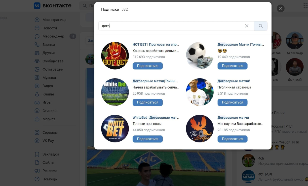 Из необычного – некоторые подписки во «ВКонтакте» пятого номера, защитника «Коломны» Кадыргали Симбаева. Если покопаться, по этой теме пабликов больше (смотря какие слова ввести в поиске). Просто констатация факта.