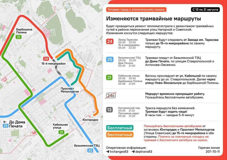 С 13 по 21 августа в Самаре из-за реконструкции тепломагистрали в районе пересечения улиц Советской и Нагорной приостановят трамвайное движение по улицам Ташкентская и Советская на участке от остановки «15-й микрорайон» до «Улицы Ставропольской».