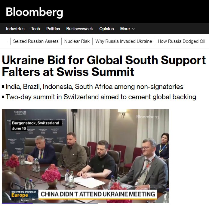 «Страны за пределами Запада уже ясно дали понять, что ни один форум по созданию условий для мира без участия России не сработает», – пишет Bloomberg.