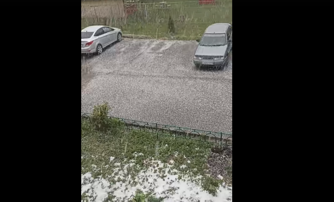 В редакцию прислали видеоролик, на котором видно, как с неба сыпется достаточно крупный град, покрывая автомобили и тротуар возле дома.