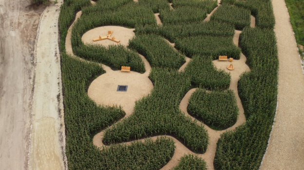Для детей – качели и батуты, для взрослых лавочки, а скоро ещё будут гамаки, перископ, и даже построят мельницу и башню, которые соединят между собой подвесным мостом. А уже сейчас можно прокатится на тракторе вокруг лабиринта. Его площадь один гектар, на его создание ушло 9,5 тыс. зёрен. Но несмотря на внушительные размеры, заблудиться здесь невозможно – из любой точки легко найти выход.