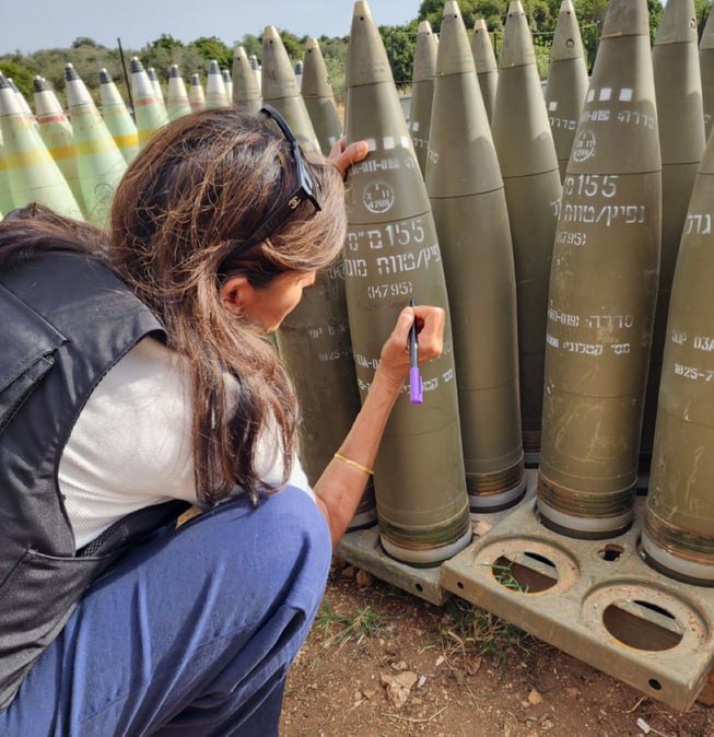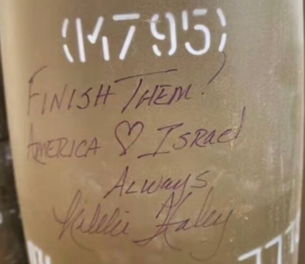 В соцсетях расходятся фото, на которых, предположительно, республиканка Никки Хейли пишет на израильском снаряде «Прикончите их».