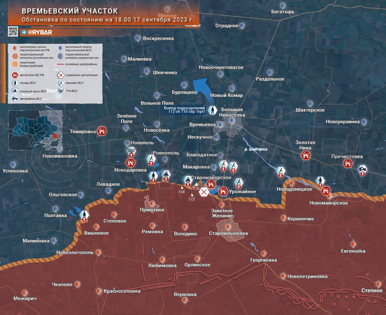 По данным Воина ДВ, на участке севернее Новомайорского, противник из состава 35 обрмп был вынужден отступить в виду потери боеспособности. По той же причине один из батальонов 110-й бригады территориальной обороны ВСУ был полностью выведен из зоны боевых действий и заменен подразделениями 127-й бригады ТрО.