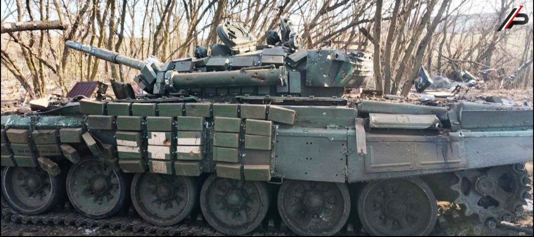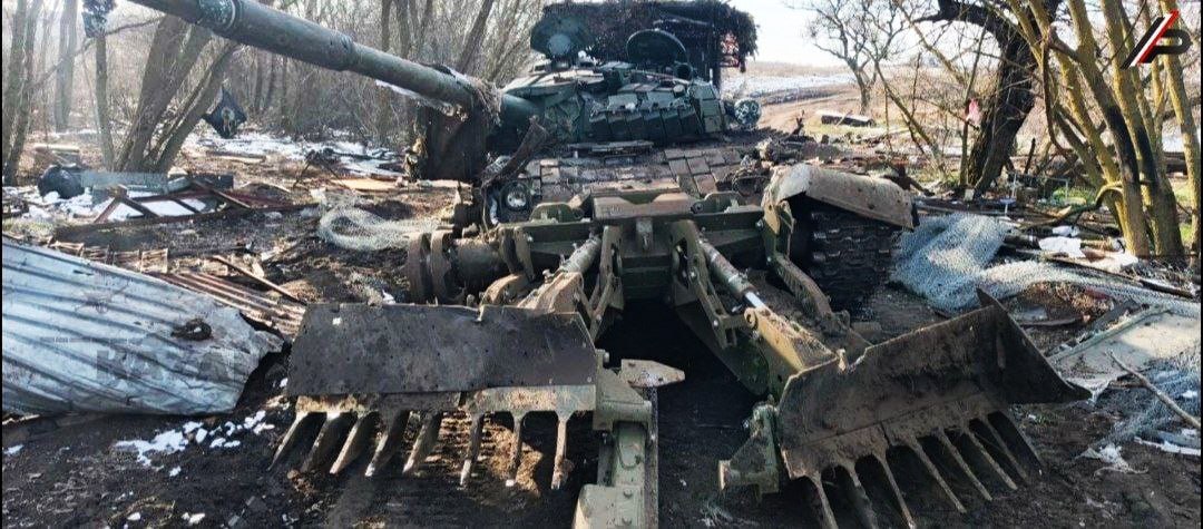 Бойцы 70 мсп вытащили в тыл подбитый украинский танк Т-72М1 с ножевым тралом Track Width Mine Ploughs (TWMP), разработки британской Pearson Engineering. Выглядит ремонтопригодным.
