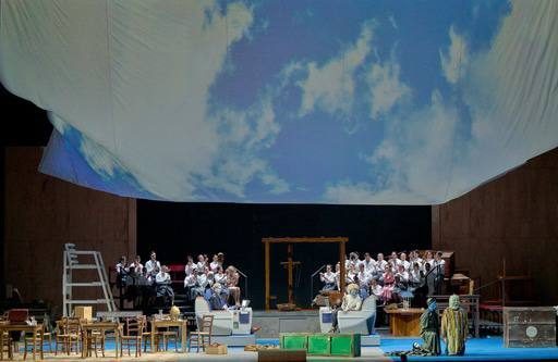Из всего этого разнообразия постановочная команда (дирижер – Пабло Херас-Касадо, режиссура – Йосси Вилер и Серджо Морабито) аскетически выбирают, в качестве доминирующих, настроения скорби и меланхолии. Здесь даже Иро – не раблезианский обжора, чьи нападки на переодетого стариком Улисса призваны оттенить трагическое противостояние последнего – с женихами Пенелопы. Иро здесь – в сущности такое же зависшее в неопределенности существо, как и другие персонажи: в данном случае «зависшее» в облике завсегдатая некого кафе, бара, столовки (этот кусочек игрового пространства обозначен полом в клеточку и деревянными столиками со стульями). Поющий эту партию Йорг Шнайдер появляется в этом облике ещё в Прологе: его забулдыга – один из тех, кто воплощает аллегорию Человеческой Слабости; добрую половину первого акта он потом проспит, сидя за столом.