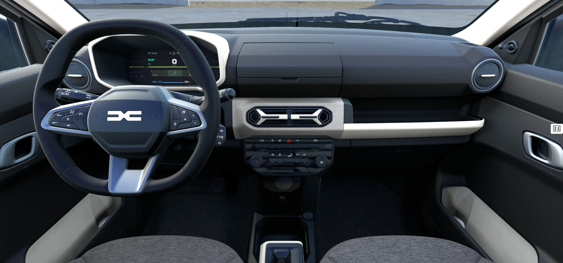 В стандартное оснащение Dacia Spring Essential 45 входят шесть подушек безопасности, система автоматического аварийного торможения (AEB) с расширенным функционалом, система распознавания дорожных знаков, мониторинг усталости водителя, система удержания в полосе, задние датчики парковки, круиз-контроль и кнопка вызова аварийных служб — это всё следствие введения в Европе новых норм безопасности GSR2 (Global Safety Rule 2). Во всём остальном Spring Essential 45 выглядит откровенно голеньким: кондиционера нет, стеклоподъёмники задних дверей «на вёслах», наружные зеркала с ручной регулировкой, цельная спинка заднего сиденья, простенькая аудиосистема с Bluetooth-подключением вместо мультимедийного экрана. За доплату предлагаются передний багажник объёмом 35 л (179 евро), рейлинги на крышу (249 евро), зарядный кабель длиной 6,5 м (627 евро) и различные аксессуары-держатели для салона по цене от 19 до 49 евро за штуку.