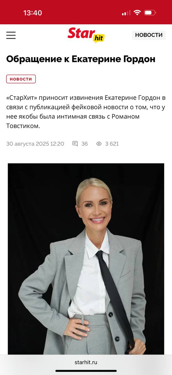 Издание «Стархит» принесло извинения за публикацию, в которой утверждалась интимная связь журналистки Екатерины Гордон с Романом Товстиком