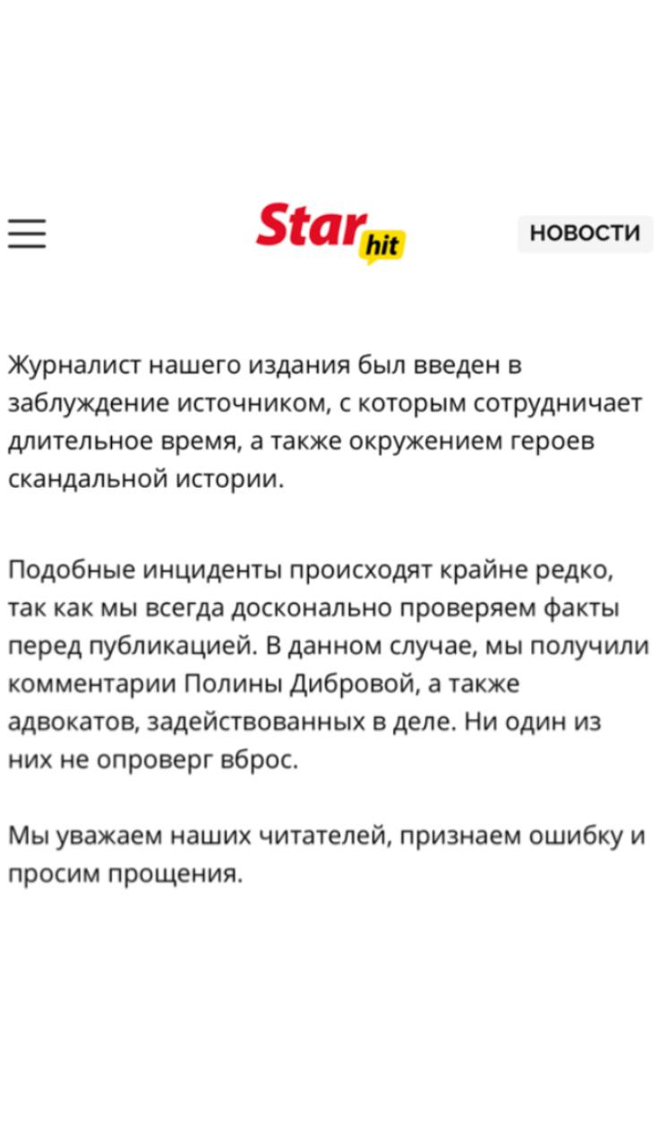 "Я рада, что скорость урегулирования конфликта со СМИ вышла на новый уровень, а качество работы пиара Полины Дибровой и лже-адвоката зловинского вы теперь видите все. Жизненные принципы соответствуют методам работы",