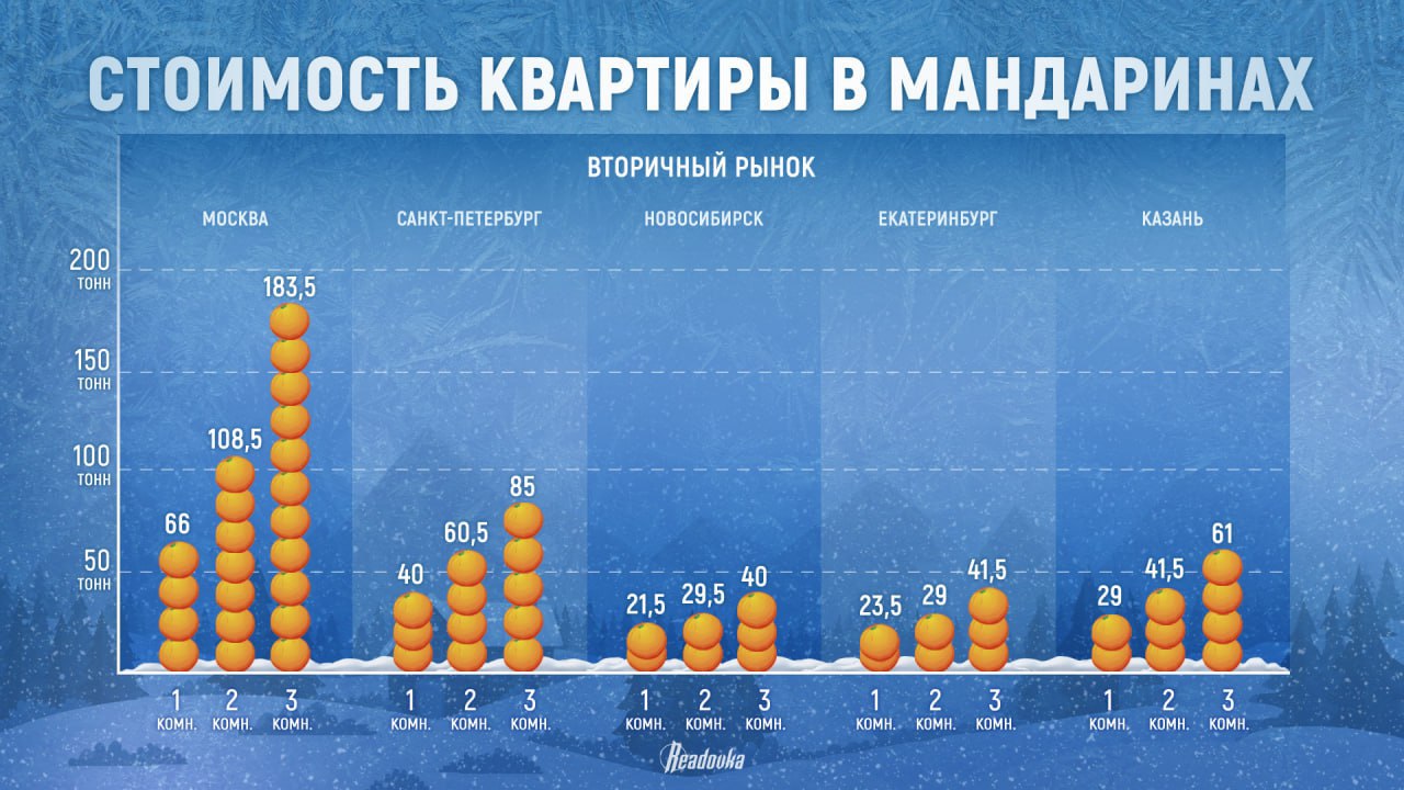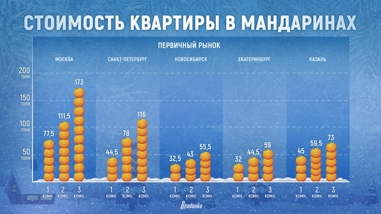 Readovka по-новому взглянула на самый новогодний фрукт. Сколько стоит жилье в 5 самых густонаселенных городах России в перерасчете на мандарины? В Москве цифры ожидаемо серьезны — по данным «Авито.Недвижимость», средняя цена квартиры на первичном рынке в столице — ₽22,8 млн. За такое «гнездышко» придется выложить 114 тонн цитрусовых. На «вторичке» же жилье в Москве обойдется в среднем в ₽32,9 млн — 164,5 тонн африканского фрукта.