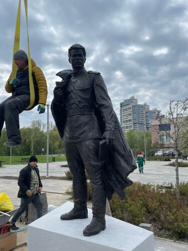 Авторами скульптуры, где поэт представлен в полной рост, военной форме и с книгой в руках, стали Денис Мельников и Захар Карамян из Москвы. До открытия памятник прикрыли.