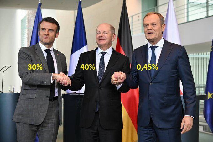 ✔️Польские соцсети высмеивают премьера Туска, который вопреки своим заявлениям смог выбить Польше только 2 млн евро из 500 млн, переданных европейским оружейным компаниям для увеличения производства артиллерийских боеприпасов.