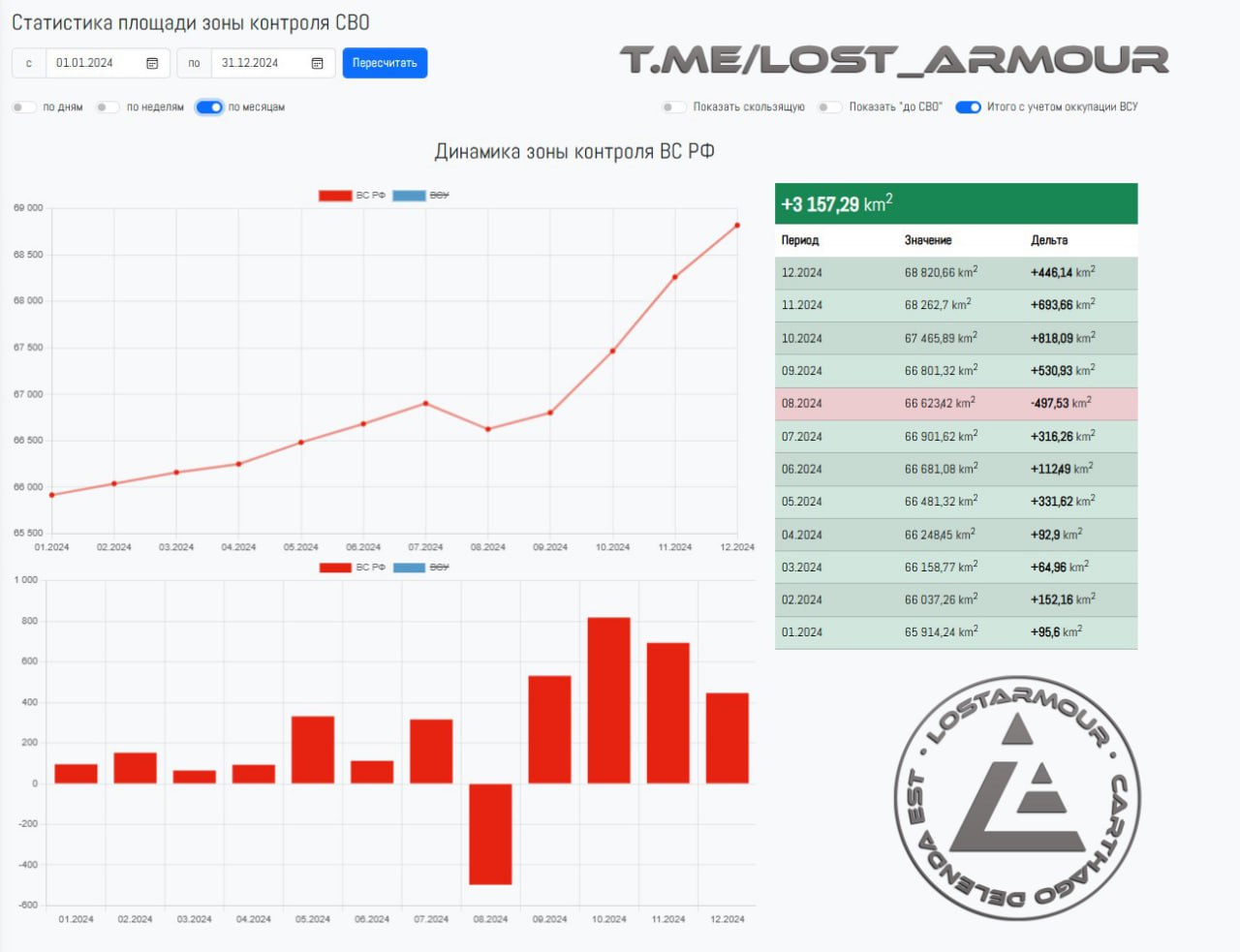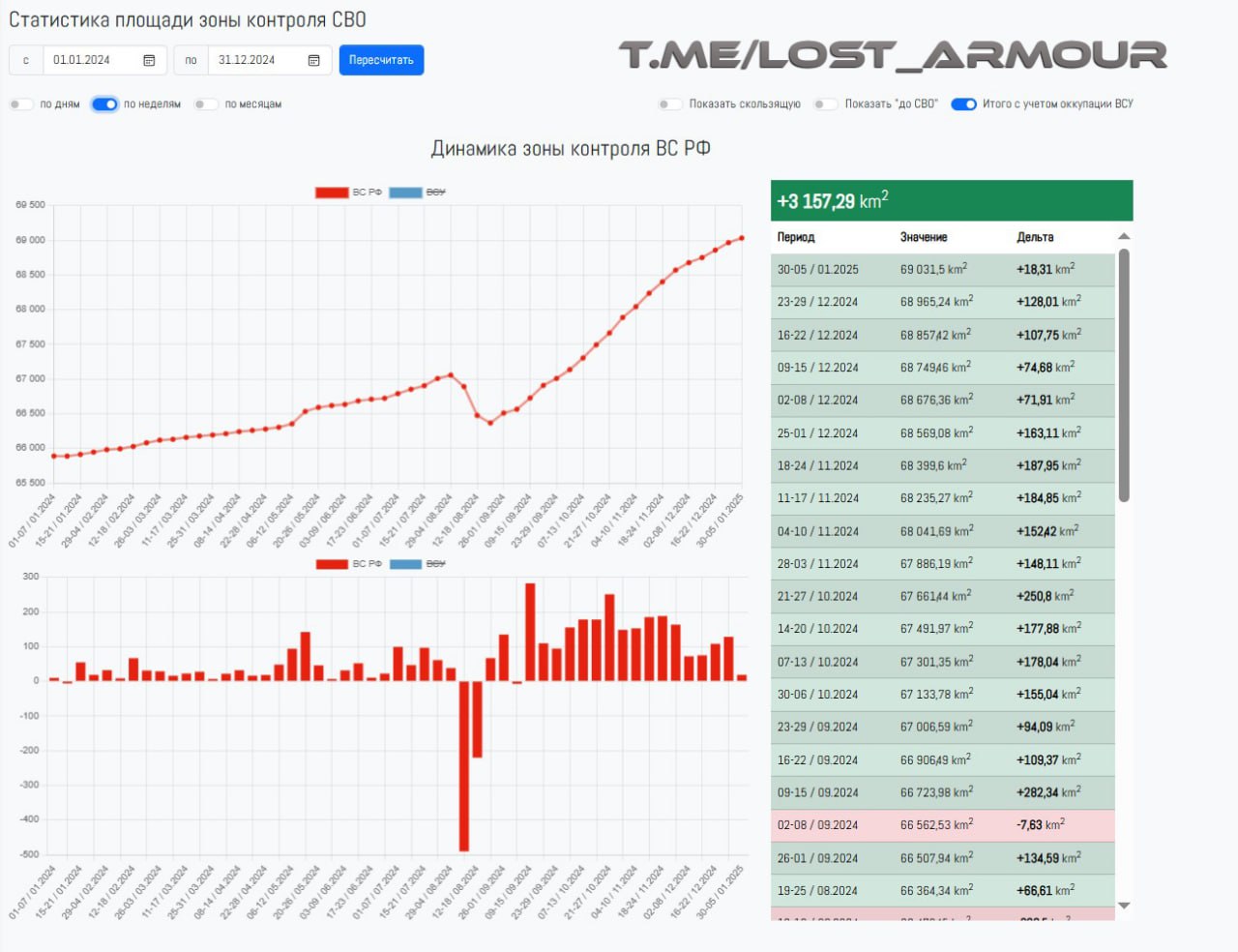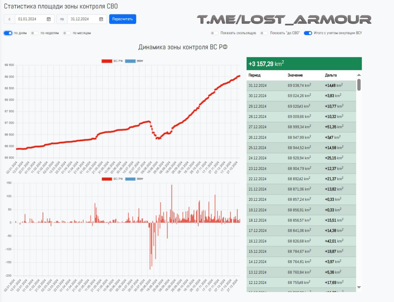 Динамика контроля территории ВС РФ в зонах СВО и КТО в Курской области в 2024 году в дневном/недельном/месячном разрезах по данным картографического сервиса LOSTARMOUR.