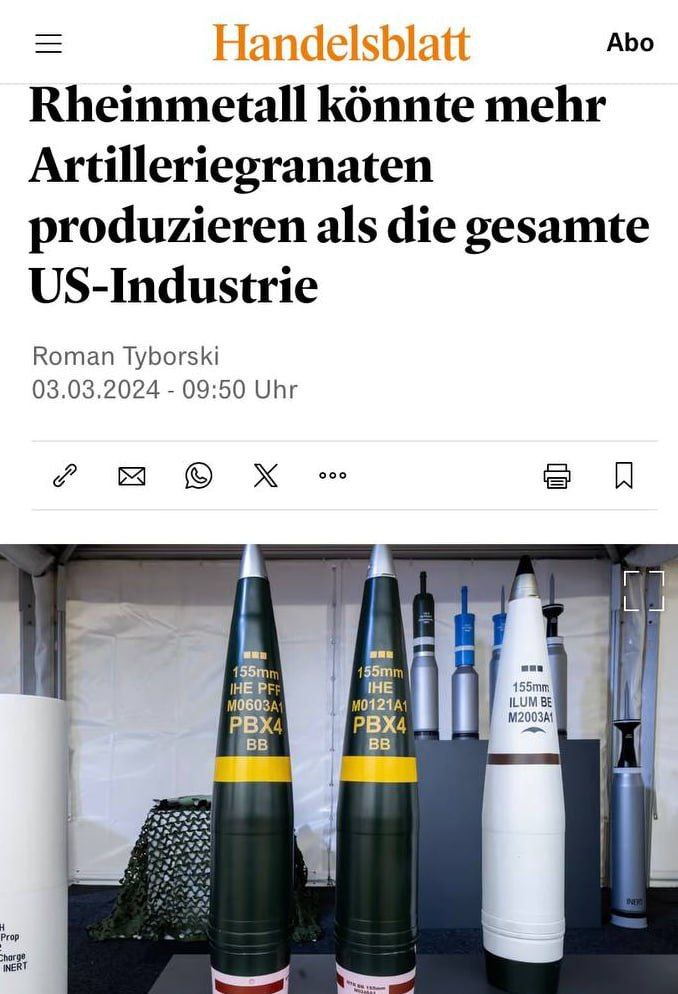По оценкам отраслевых кругов, к концу 2024 года базирующаяся в Дюссельдорфе оружейная компания может произвести до 450 тысяч артиллерийских снарядов. Это означает, что Rheinmetall производит больше снарядов, чем вся оборонная промышленность США, заявил заместитель министра обороны Чехии Ян Йирес на мероприятии в Гудзоновском институте в Вашингтоне. По оценкам отраслевых обозревателей, в этом году США могут произвести около 430 000 артиллерийских снарядов.