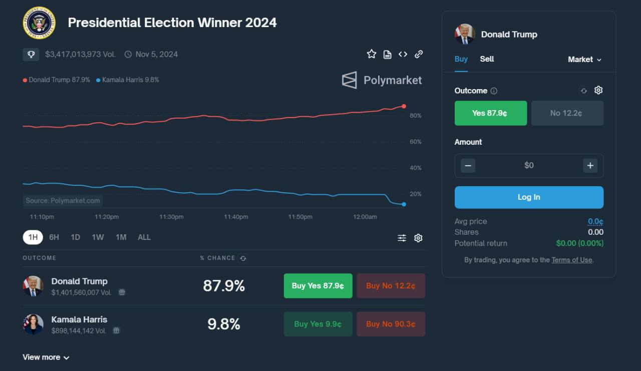 ✔️Polymarket оценивает шансы Дональда Трампа на победу на президентских выборах в 88%